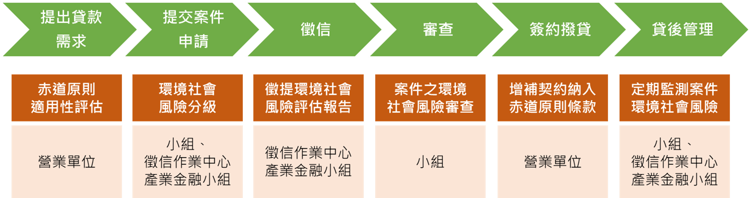配合赤道原則規範,本行制訂「赤道原則授信規範」及相關作業流程,且成立「環境社會風險小組」(下稱小組)負責赤道原則案件環境社會風險分級,並根據環境社會風險審查報告審查、作成決議,以確保案件符合赤道原則、環境及社會法規相關要求,以落實銀行ESG。